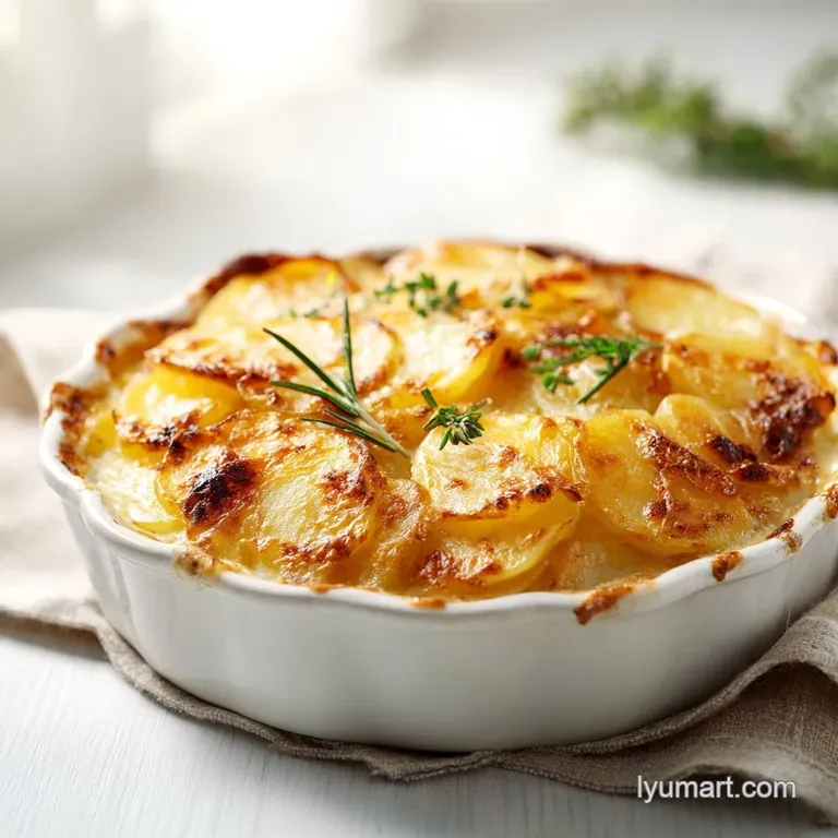 A baked potato dish layered with a creamy cheese sauce. It is typically characterized by thinly sliced potatoes and a golden brown crust created by broiling the top.