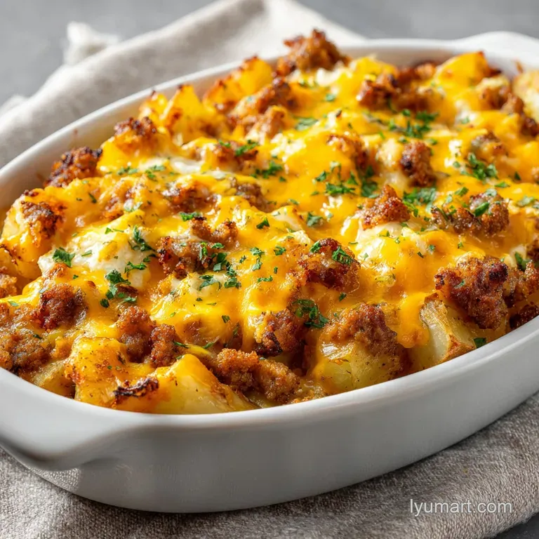 - Top the potatoes with the browned sausage and a layer of shredded cheddar cheese.