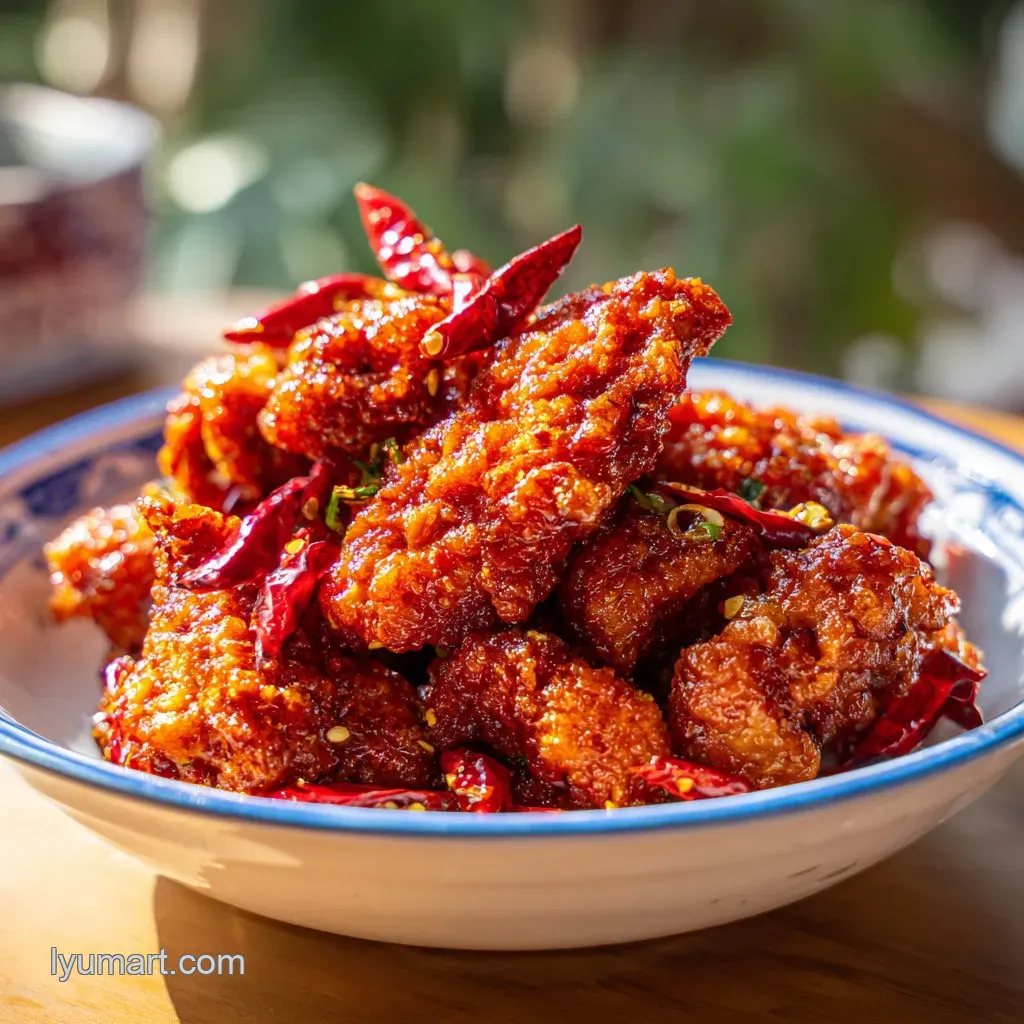 A popular Indo Chinese dish known for its balance of powerful heat and glossy, savory sweet coating. It is characterized by the presence of fried chicken pieces, cashews, and visible pieces of dried red chilies in the thick sauce.